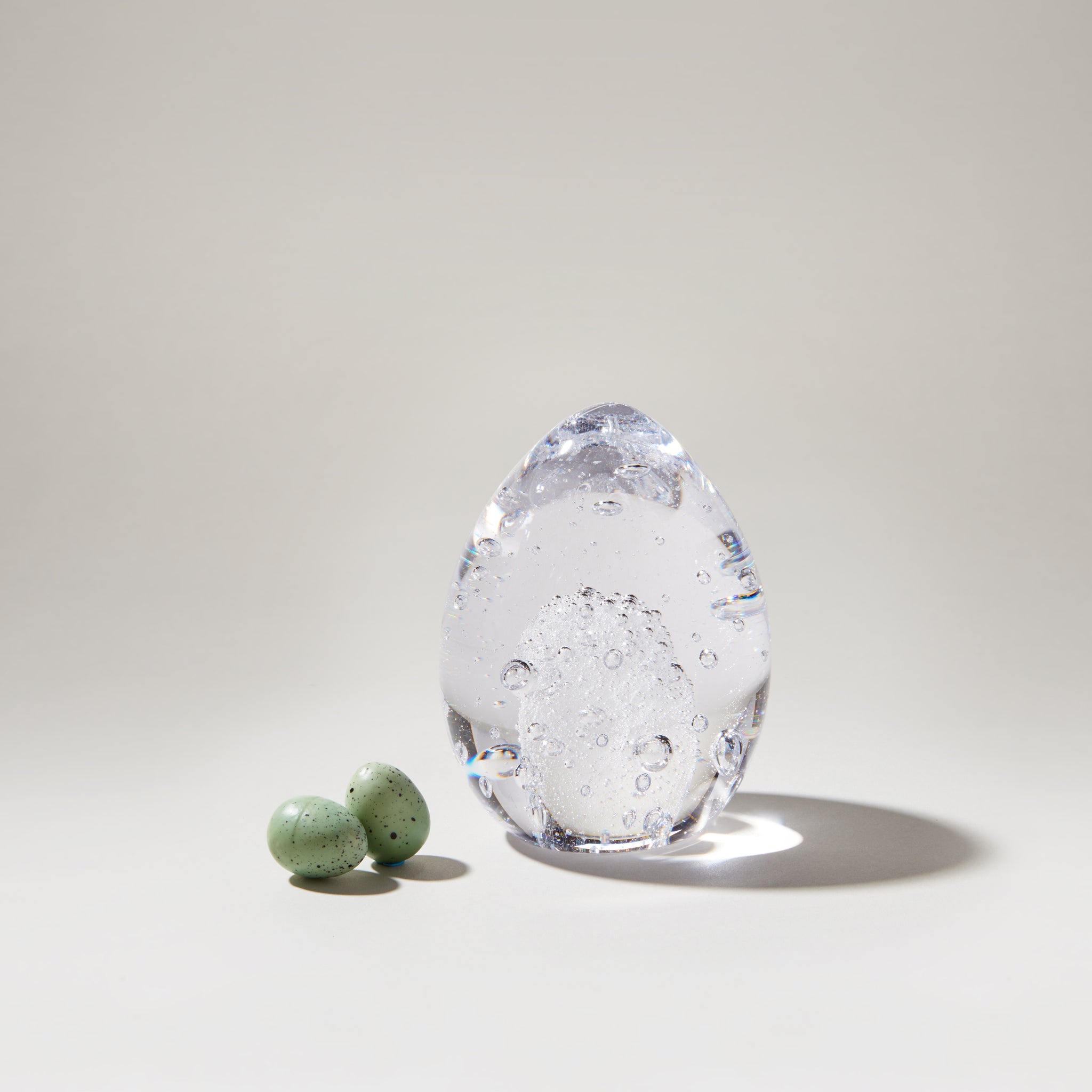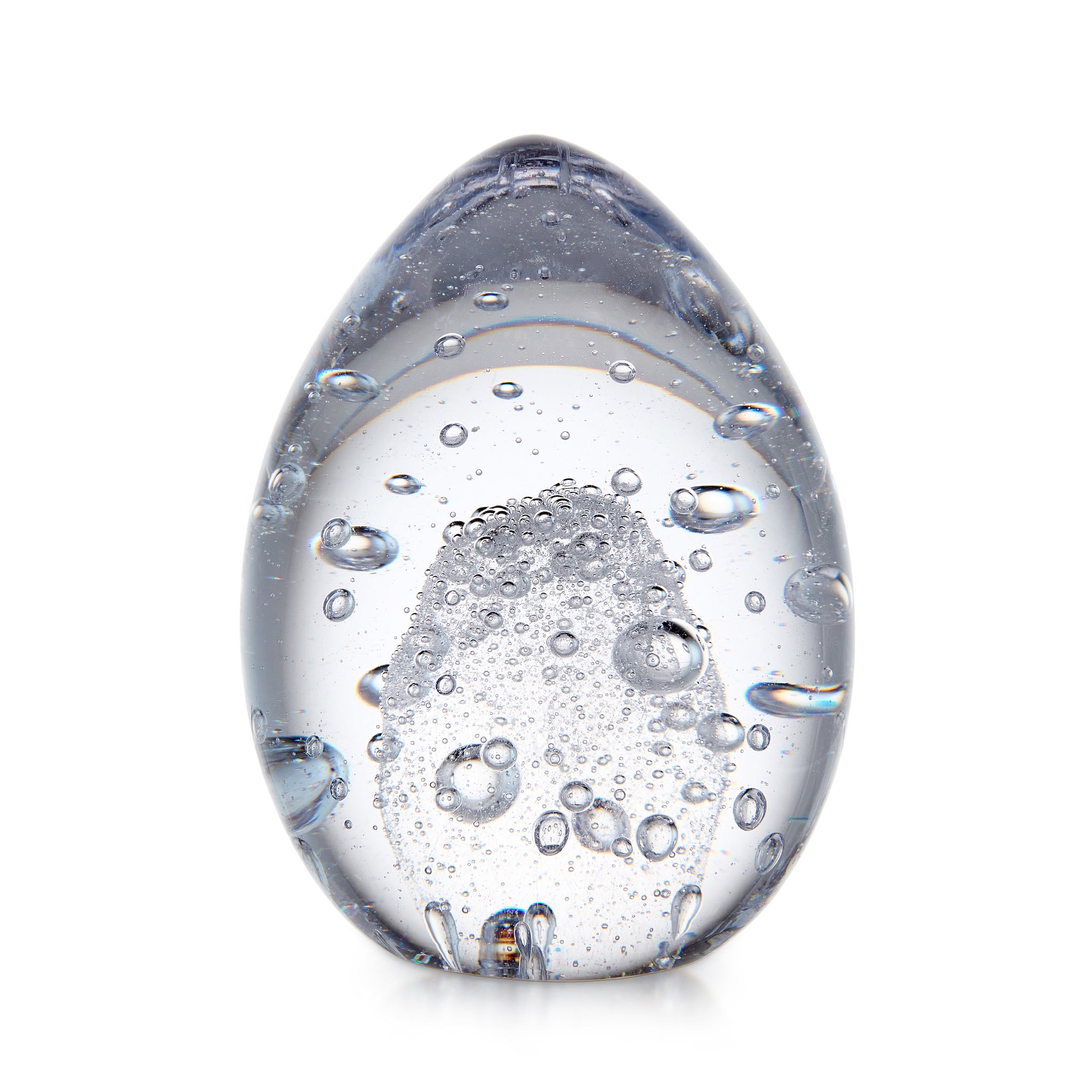 The Vela Egg returns from the archives as a study in light, movement, and suspended form. Fine bubbles and larger spheres are carefully encased within clear glass, creating a sense of lift inside the piece.