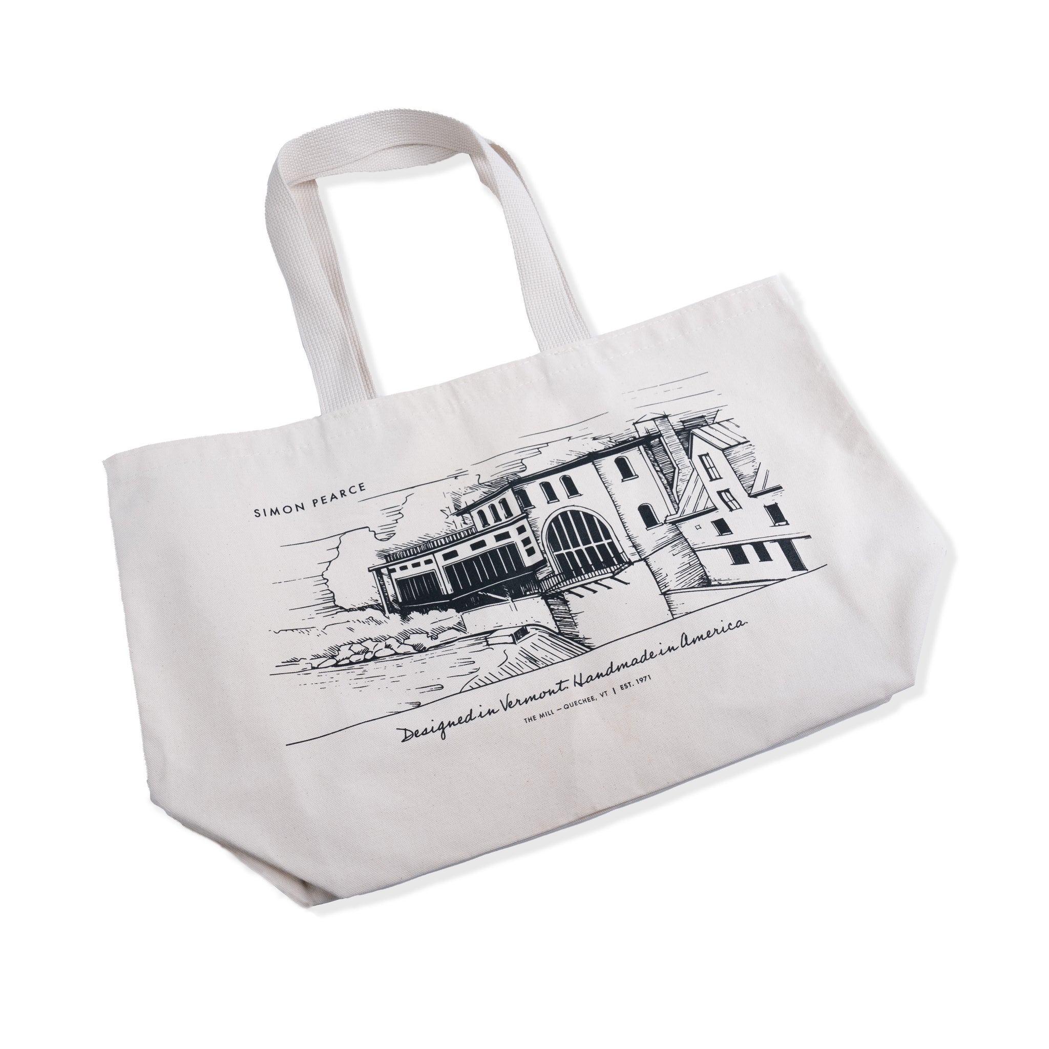 The Simon Pearce Mill Tote Bag by Enviro-Tote™ merges craftsmanship with sustainability. Handmade in the USA since 1990, each bag is meticulously cut, hand-stitched, and screen-printed at Enviro-Tote’s Londonderry, NH facility. Featuring an exclusive design of the historic Simon Pearce Mill in Quechee, VT, this environmentally friendly tote is perfect for those who appreciate quality and eco-conscious design.