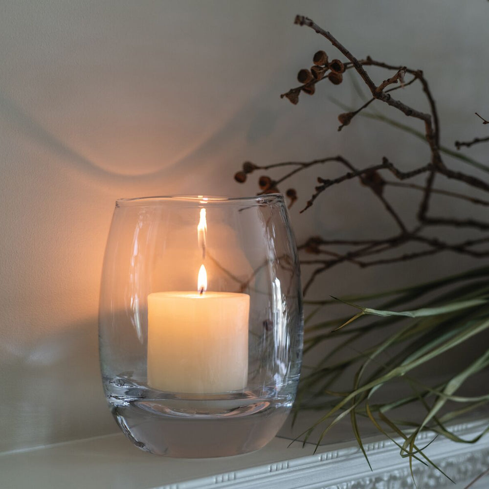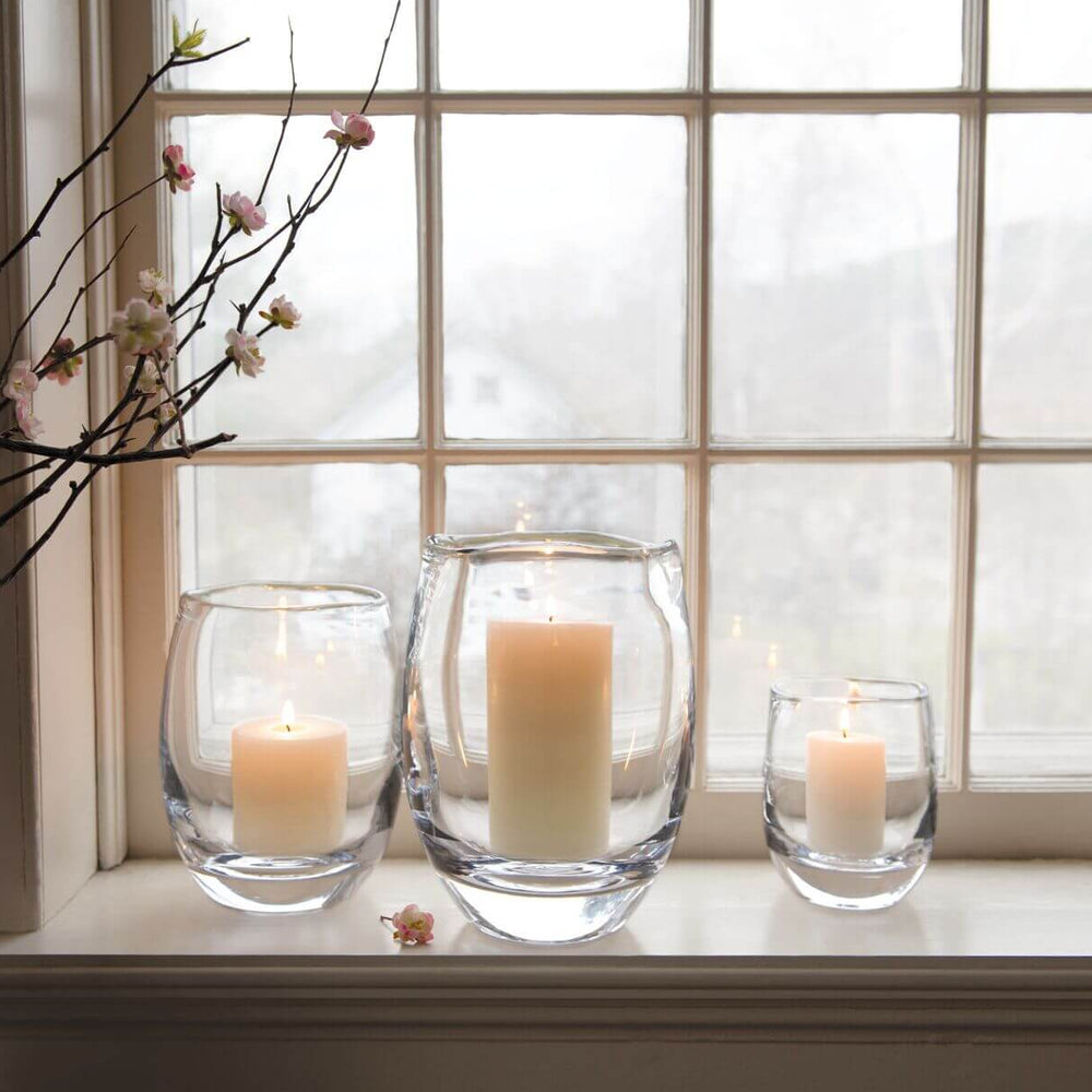 Ivory Pillar Candle included. Comes with a 3" x 4" for the L hurricane, 3" x 3" for M, and 2" x 3" for S.