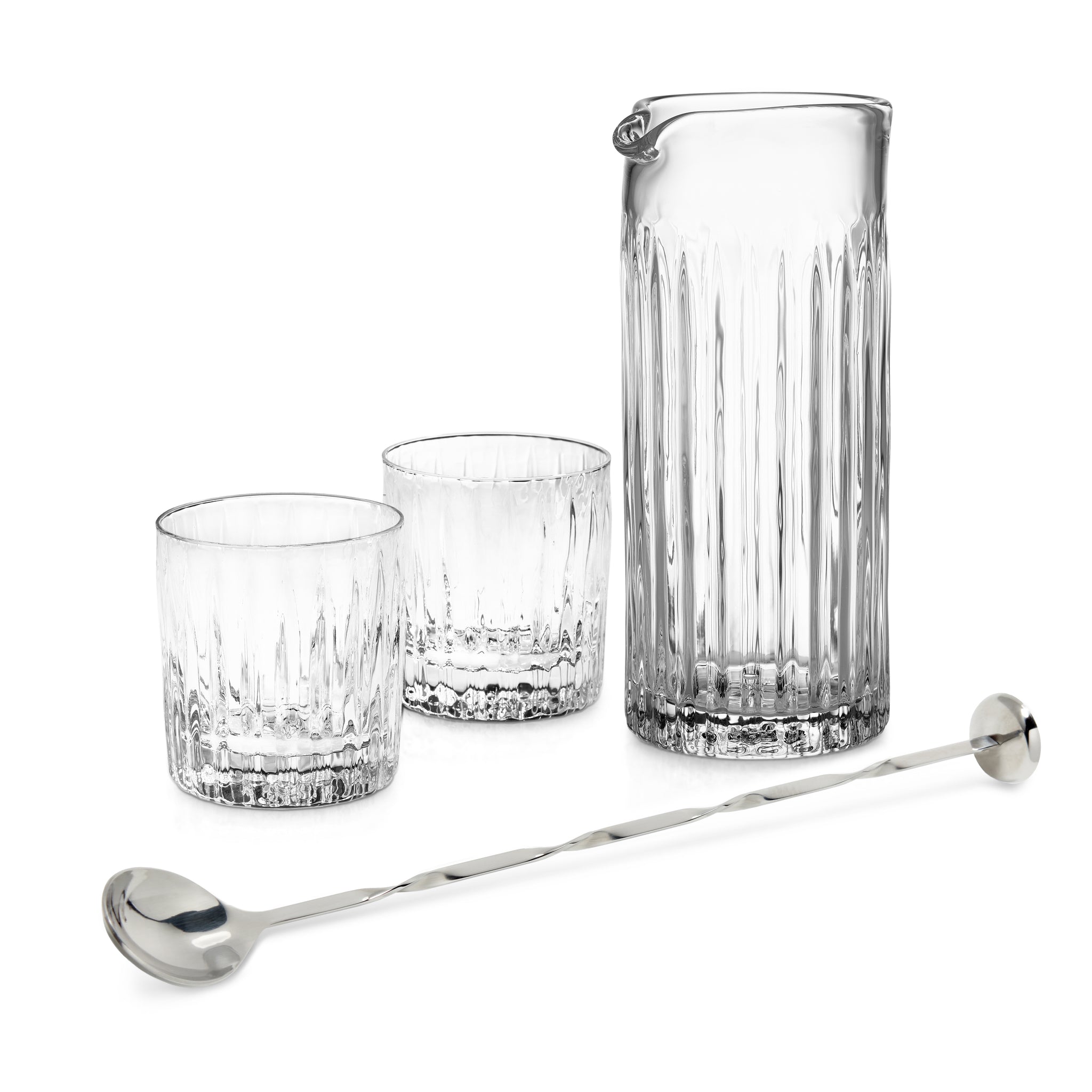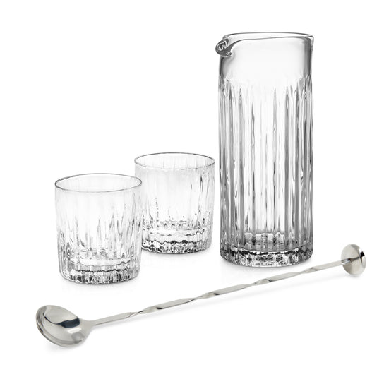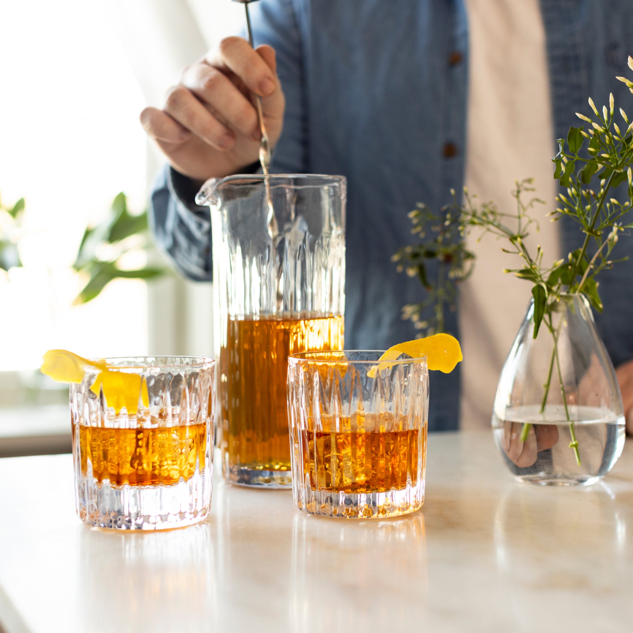 Our most dimensional drinkware, all brought together in one curated set. Featuring fluting inspired by the classic architecture of Greek columns, the Montpelier Pitcher and two Montpelier Double Old-Fashioned glasses pair with our stainless steel Rosendahl stirring spoon for a set that’s ready for mixing cocktails, mocktails, or whatever the moment calls for.