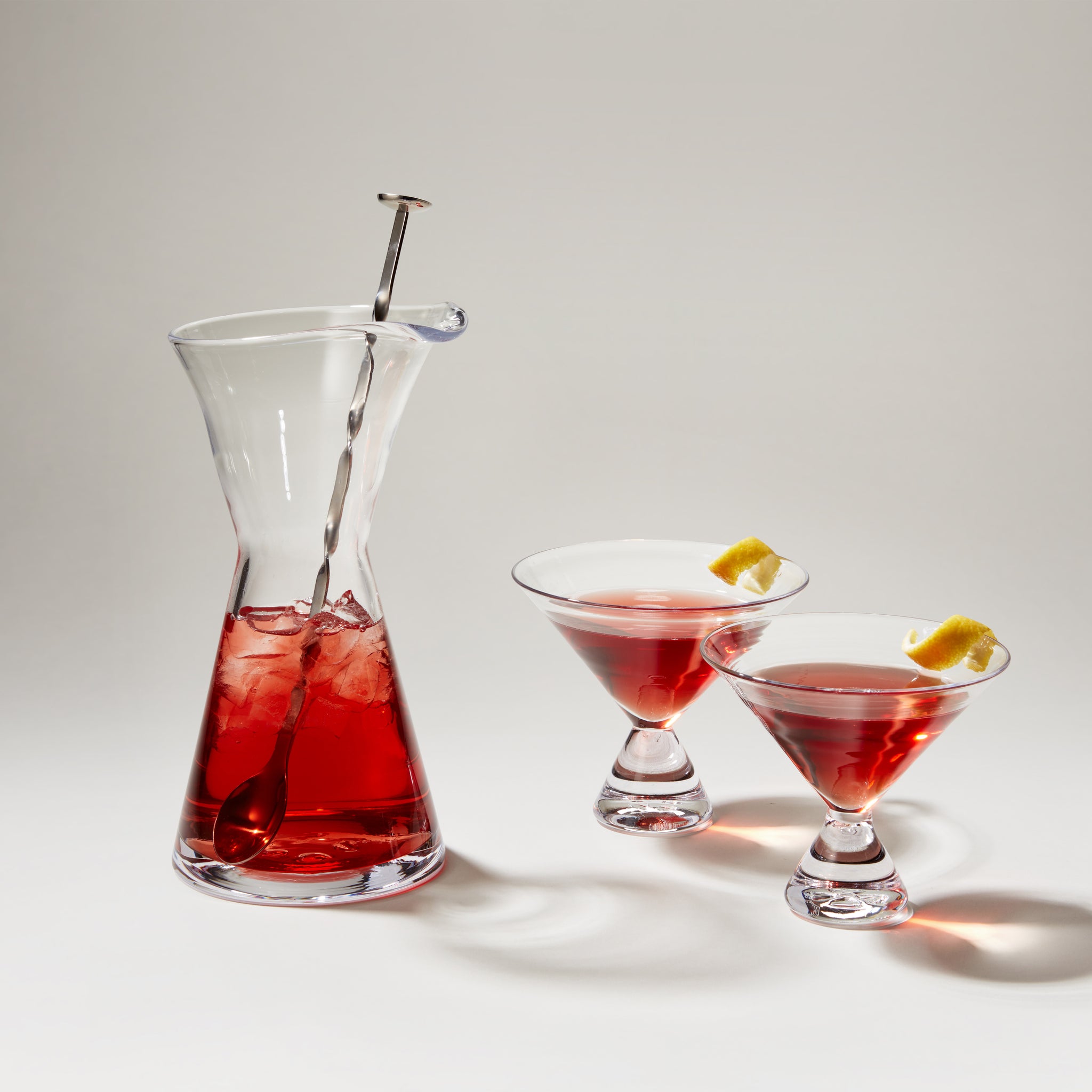 The quartino carafe interprets this form through an inverted-cone design, creating a tapered, handle-free silhouette that offers a natural grip and serves two to four drinks with ease. The Westport Martini Glasses echo the collection’s sculptural clarity in a glass for classic cocktails or creative new pours. Completing the set, the Rosendahl Grand Cru Stirring Spoon adds a polished stainless steel tool designed for smooth stirring and precise measuring.